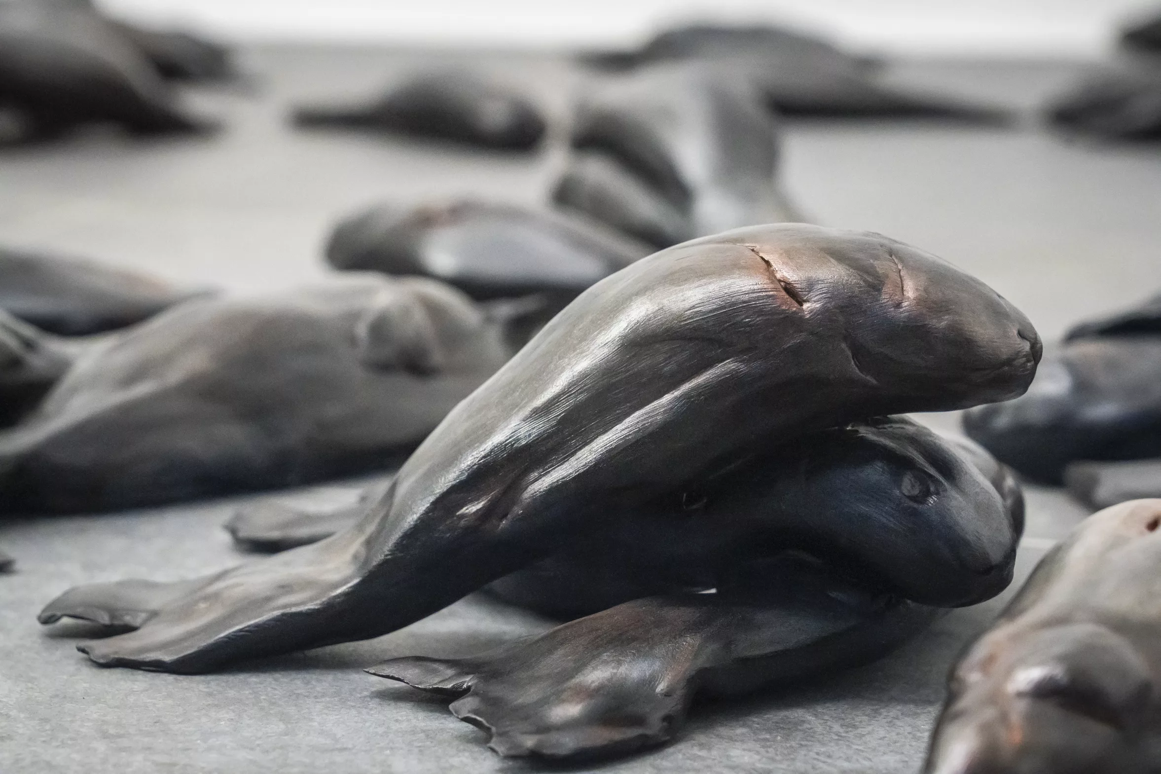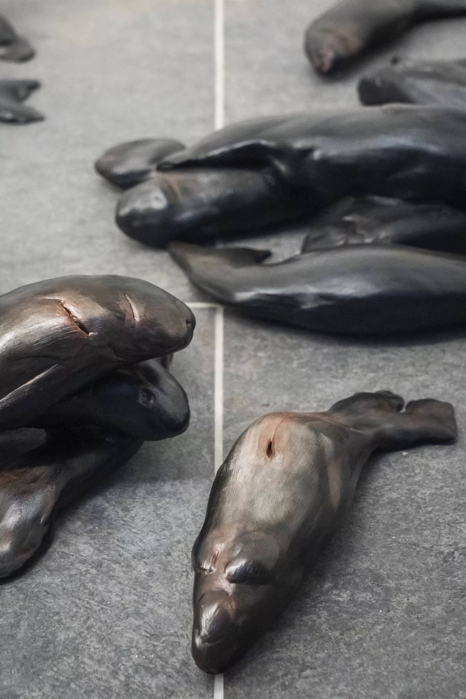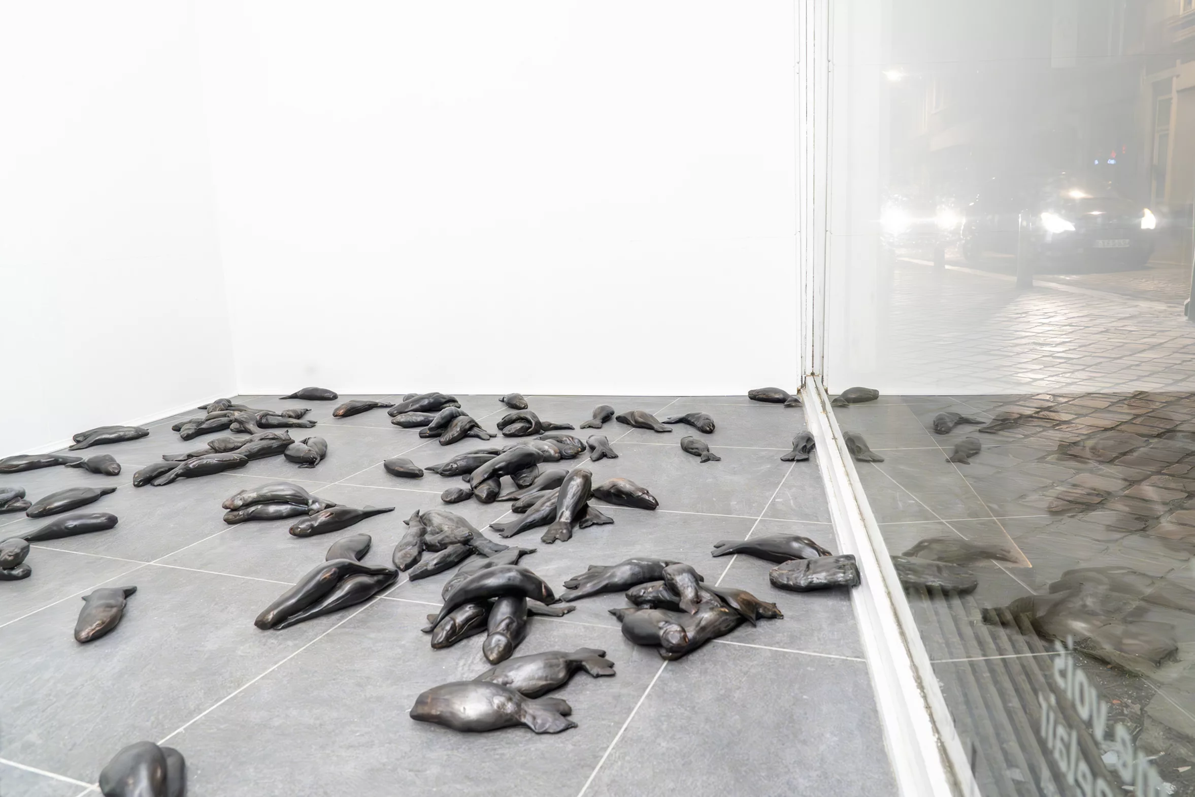 L’installation Si tu me vois est composée de 144 poissons de glaise (82 sculptures), réduits à des formes énigmatiques, qui tapissent le sol comme dans les documentations des trombes d’animaux.